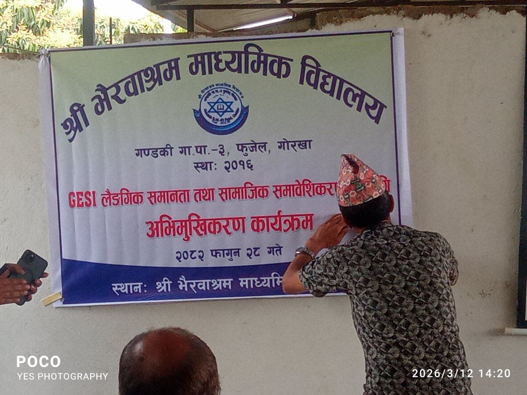 рд╢реНрд░реА рднреИрд░рд╡рд╛рд╢реНрд░рдо рдорд╛рдзреНрдпрдорд┐рдХ рд╡рд┐рджреНрдпрд╛рд▓рдпрдорд╛ рд▓реИрдВрдЧрд┐рдХ рд╕рдорд╛рдирддрд╛ рддрдерд╛ рд╕рд╛рдорд╛рдЬрд┐рдХ рд╕рдорд╛рд╡реЗрд╢реАрдХрд░рдг (GESI) рд╕рдореНрдмрдиреНрдзреА рдЕрднрд┐рдореБрдЦреАрдХрд░рдг рдХрд╛рд░реНрдпрдХреНрд░рдо рд╕рдлрд▓рддрд╛рдкреВрд░реНрд╡рдХ рд╕рдореНрдкрдиреНрди рднрдПрдХреЛ рдЫред рд╡рд┐рджреНрдпрд╛рд▓рдп рдкрд░рд┐рд╕рд░рдорд╛ рдЖрдпреЛрдЬрд┐рдд рдЙрдХреНрдд рдХрд╛рд░реНрдпрдХреНрд░рдо реирежреореи рд╕рд╛рд▓ рдлрд╛рдЧреБрди реирео рдЧрддреЗ рдЖрдпреЛрдЬрдирд╛ рдЧрд░рд┐рдПрдХреЛ рдерд┐рдпреЛред